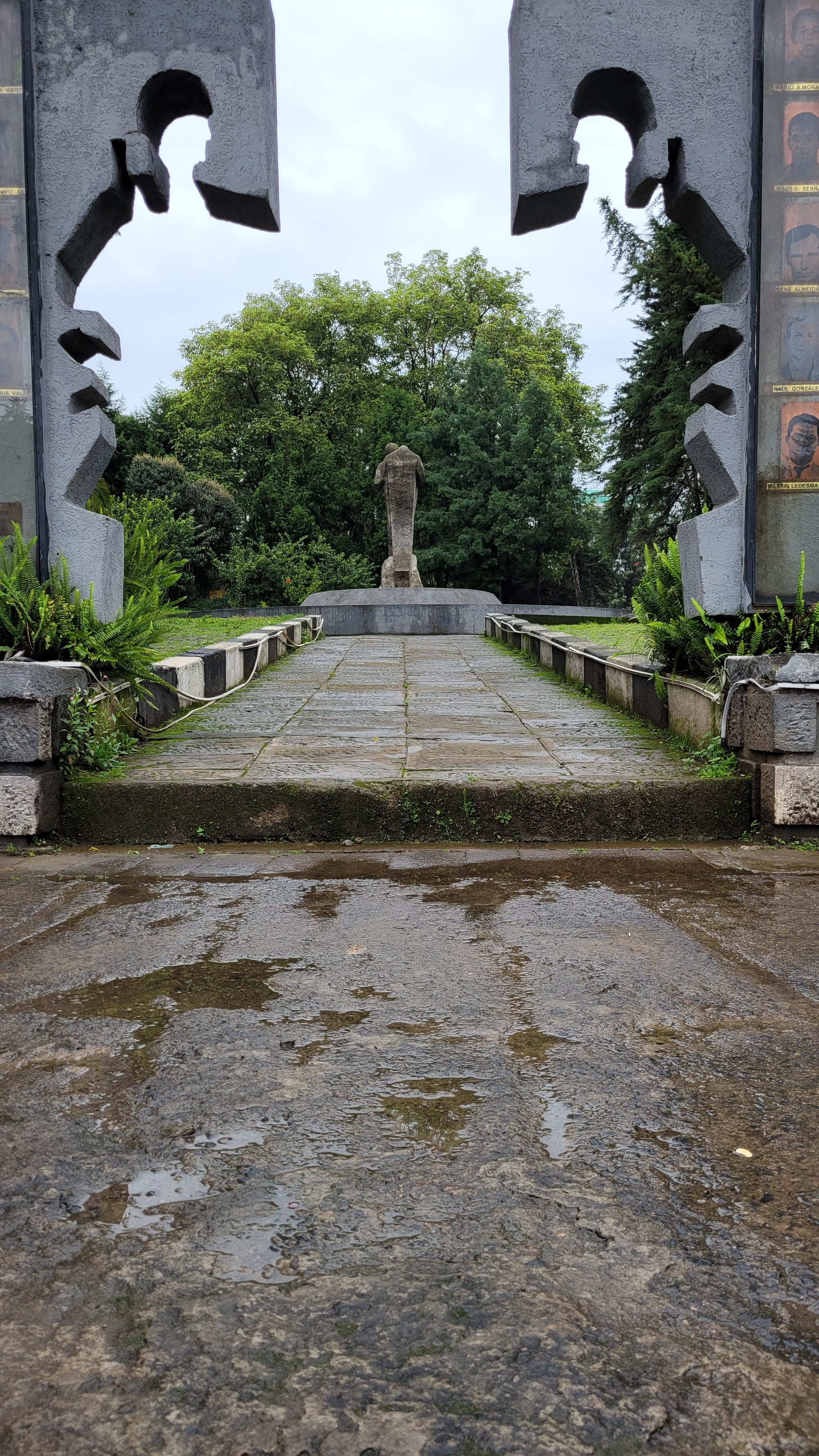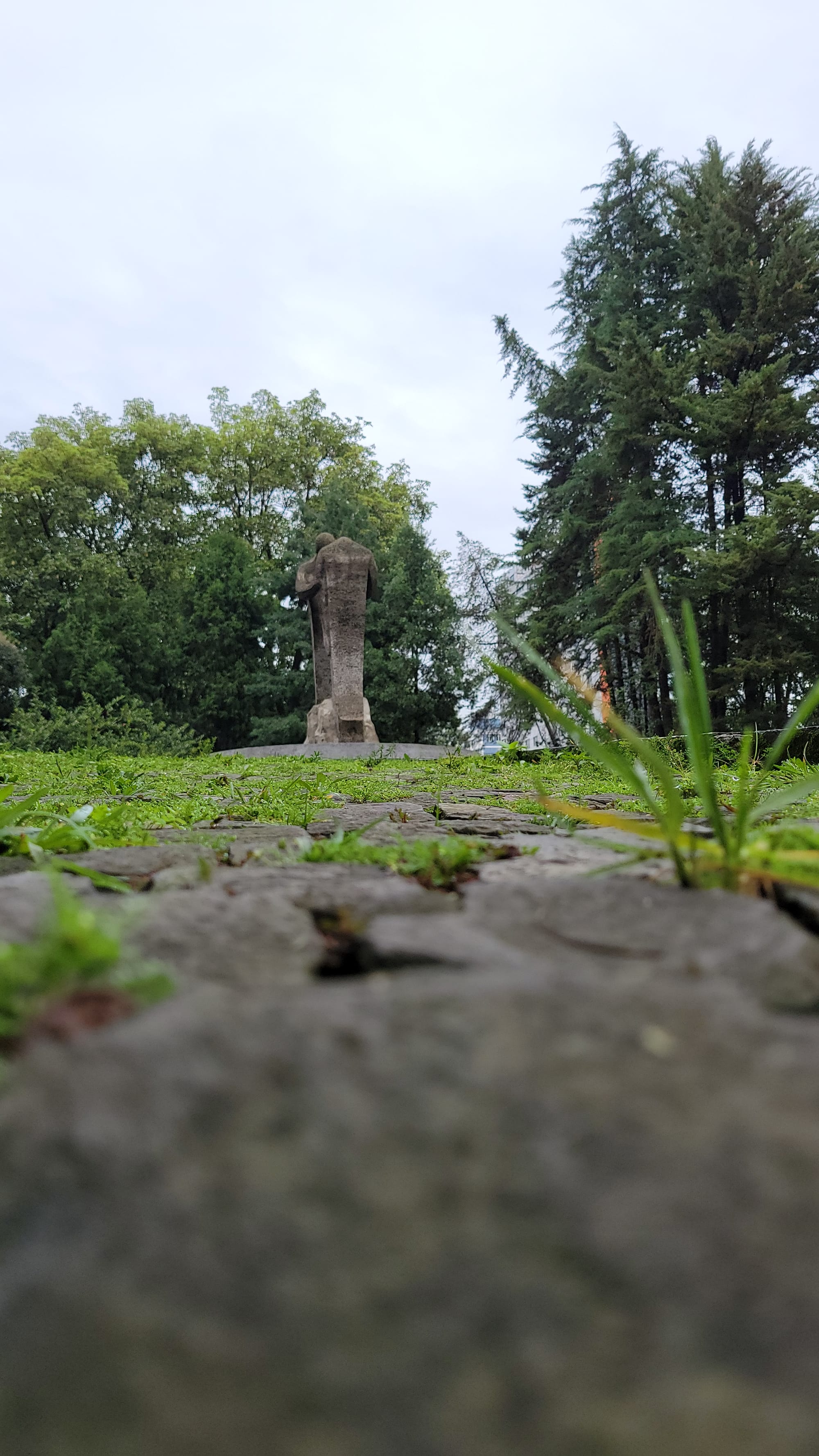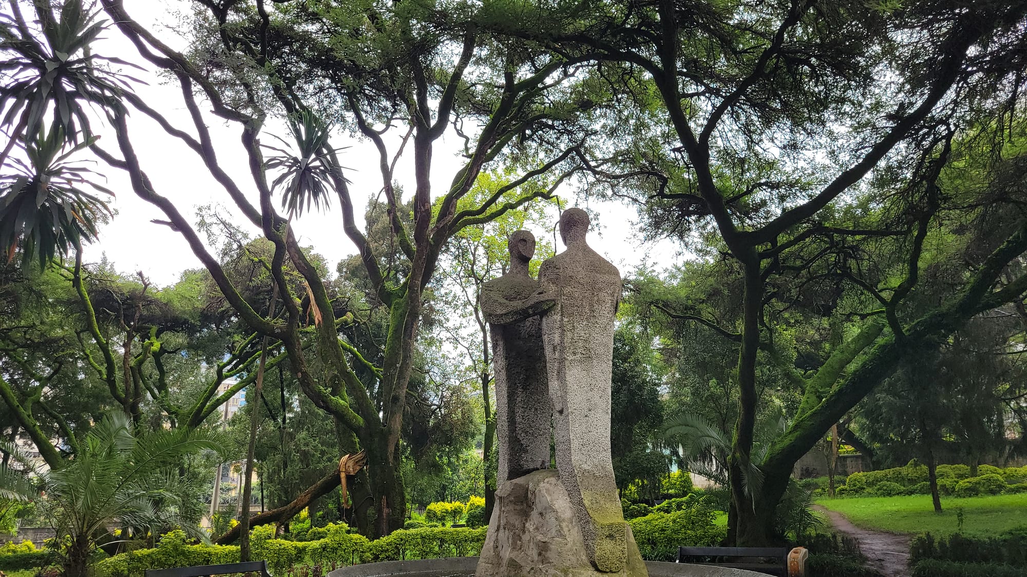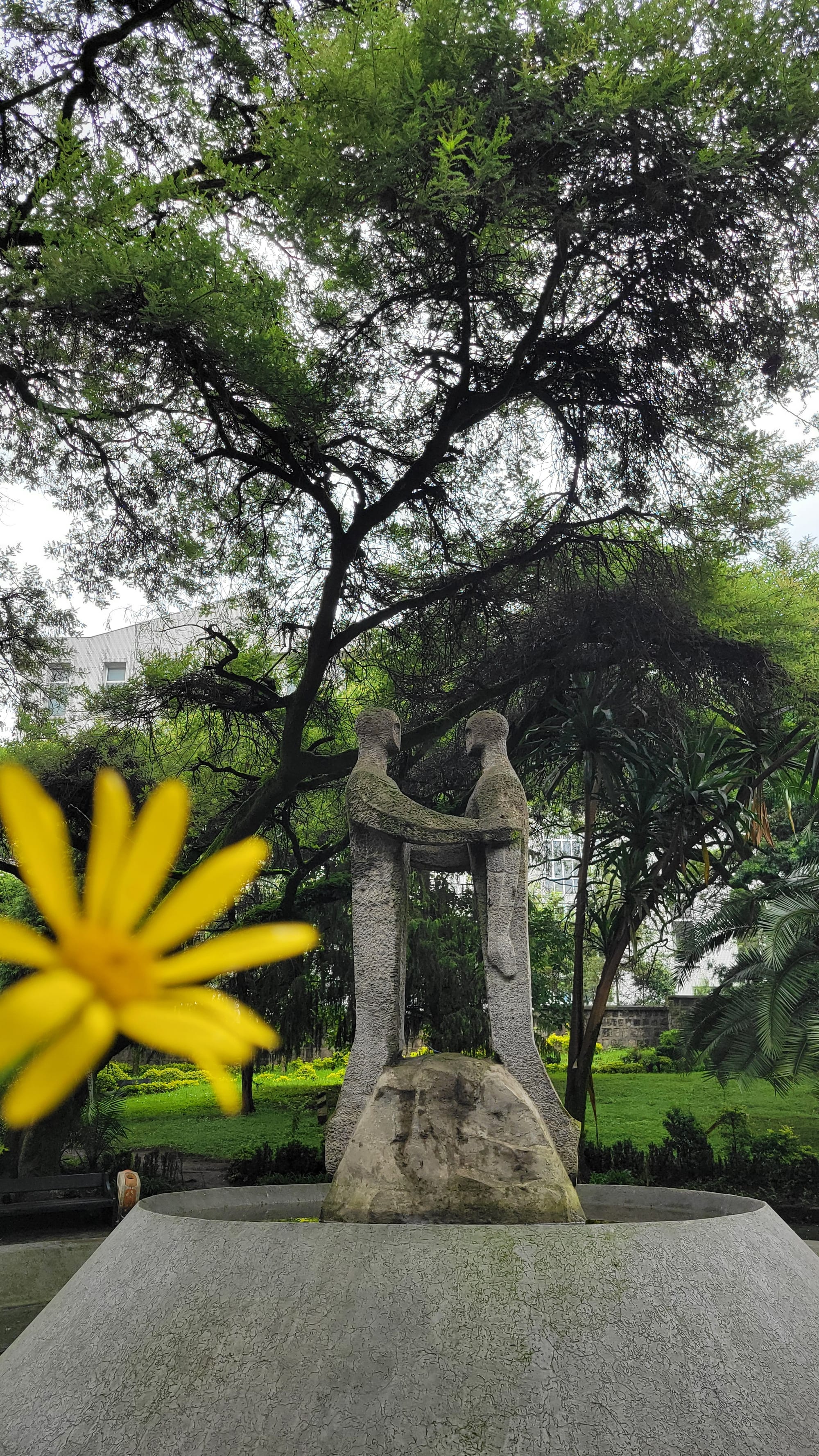 On the opposite sides of the park, you'll find two stone carved sculptures of two people facing each other showing comradery.