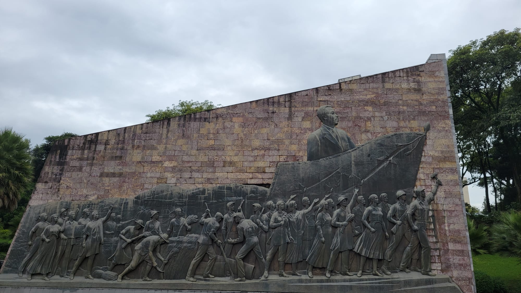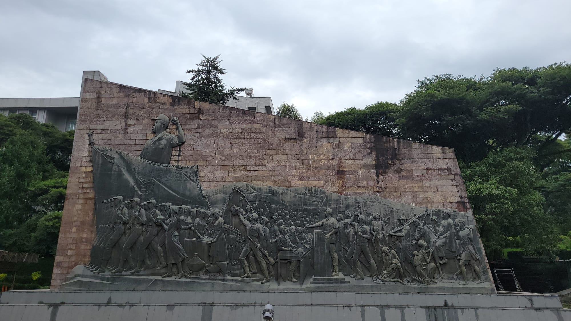 On each side of the tall monument, you'll find two wall reliefs, telling a story of the Ethiopian people's struggle to overthrow the last Emperor of Ethiopia, Emperor Haile Selassie, and a representation the revolutionary process with Mengistu Haile Mariam in military uniform. On the right wall relief, you can see The Emperor riding on horseback, seemingly ignoring the people affected by terrible famine just below them.