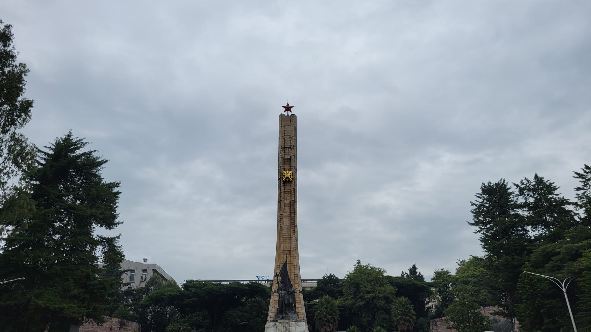 As you enter the Park, you're greeted with the 50-meter-tall monument, a gift from North Korea, which adorns a red star on the top, and a golden badge of honor that contains a hammer & sickle (both of which symbolize communism). Below it, you'll see sculptures of male and female Kalashnikov-wielding soldiers. It was built to remember the Ethiopian and Cuban soldiers involved in a military conflict between Somalia and Ethiopia, from 1977 to 1978, over the sovereignty of a region in the eastern part of Ethiopia called Ogaden. Ethiopia had garnered support from other communist nations, the Soviet Union, & Cuba. The Cubans (then being led by Fidel Castro) sent 12000 troops and airmen to help Ethiopia.